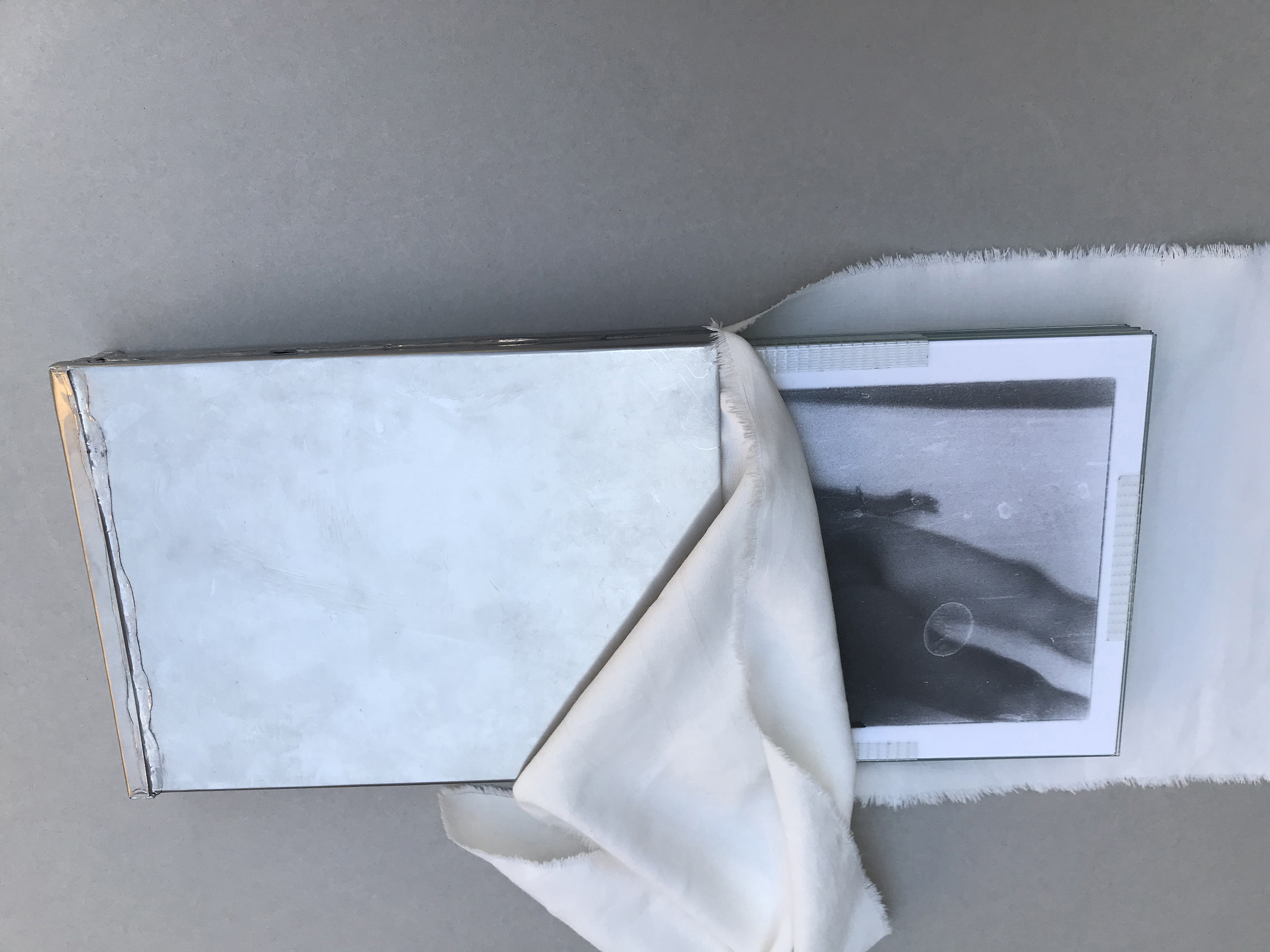 to back and sandwiched between two sheets of 2mm thick non reflective glass, these glass pages come unbound in a steel box and can be viewed either as a sequenced glass book or as individually framed 'pieces'. The 6 'pieces' - or 12 glass 'pages' (12 photographs/images) are sealed with industrial fiberglass mesh tape. The glass pieces are wrapped and protected in the stainless steel box by cloth which also acts as the book's colophon. It comes signed and numbered.
