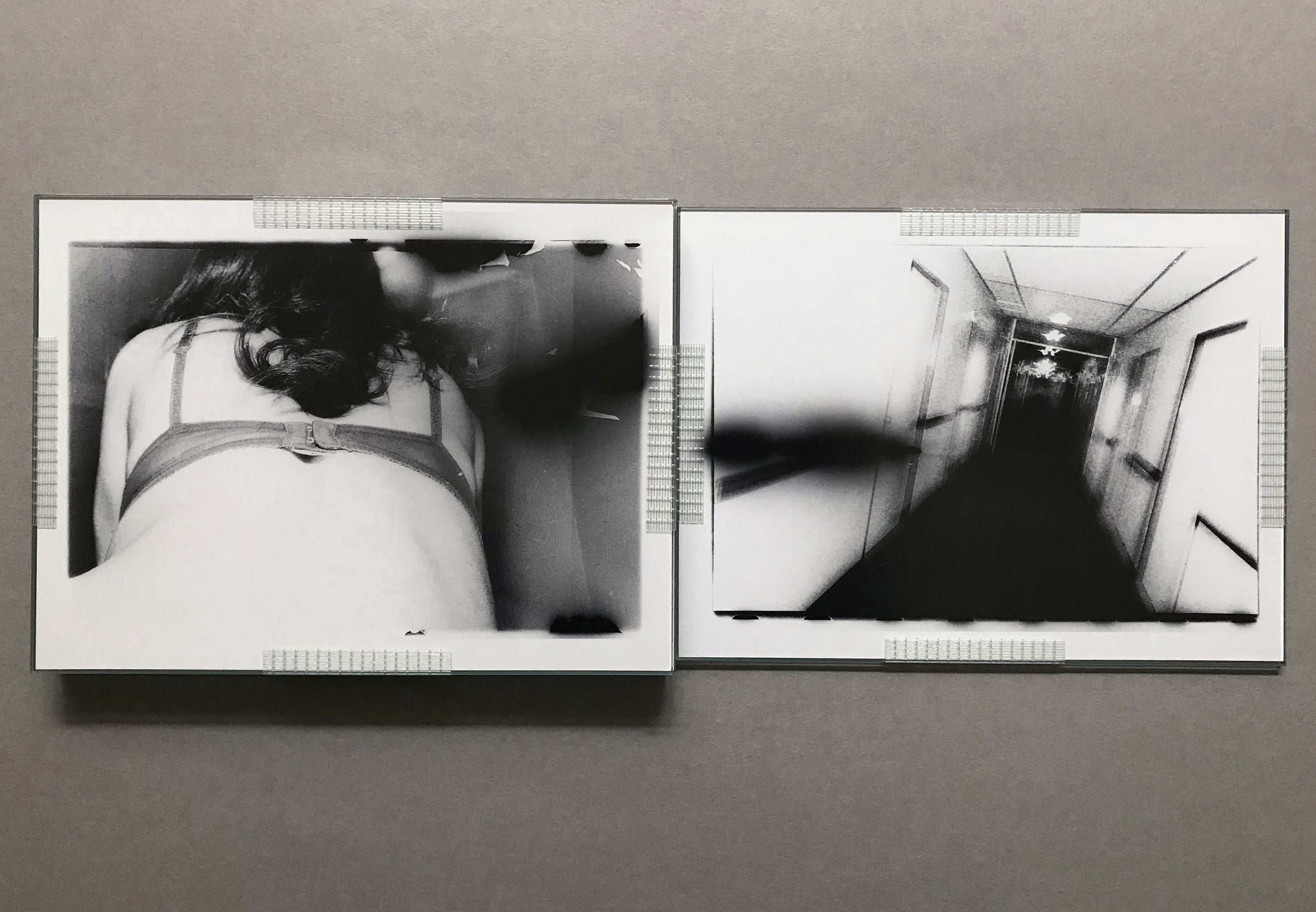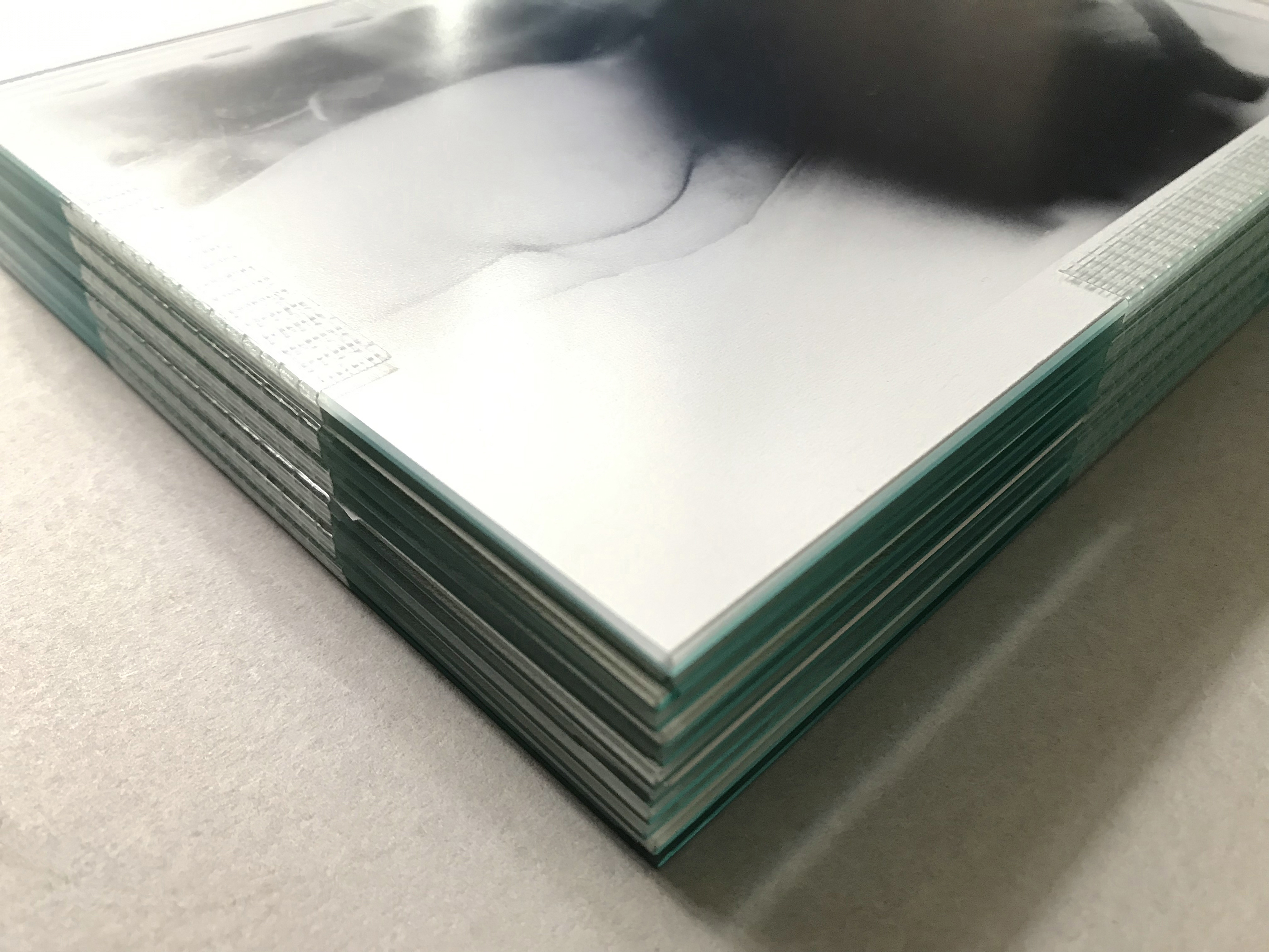 to back and sandwiched between two sheets of 2mm thick non reflective glass, these glass pages come unbound in a stainless steel box and can be viewed either as a sequenced glass book or as individually framed 'pieces'. The 6 'pieces' - or 12 glass 'pages' (12 photographs/images) are sealed with industrial fiberglass mesh tape. The glass pieces are wrapped and protected in the steel box by cloth which also acts as the book's colophon. It comes signed and numbered.
